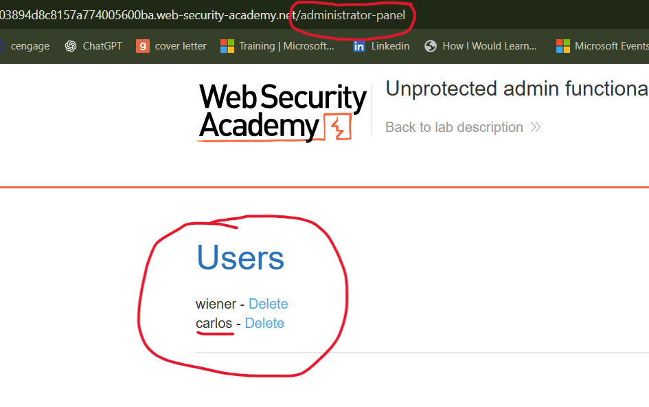 Unprotected admin panel showing users ‘carlos’ and ‘wiener’ with delete options.
